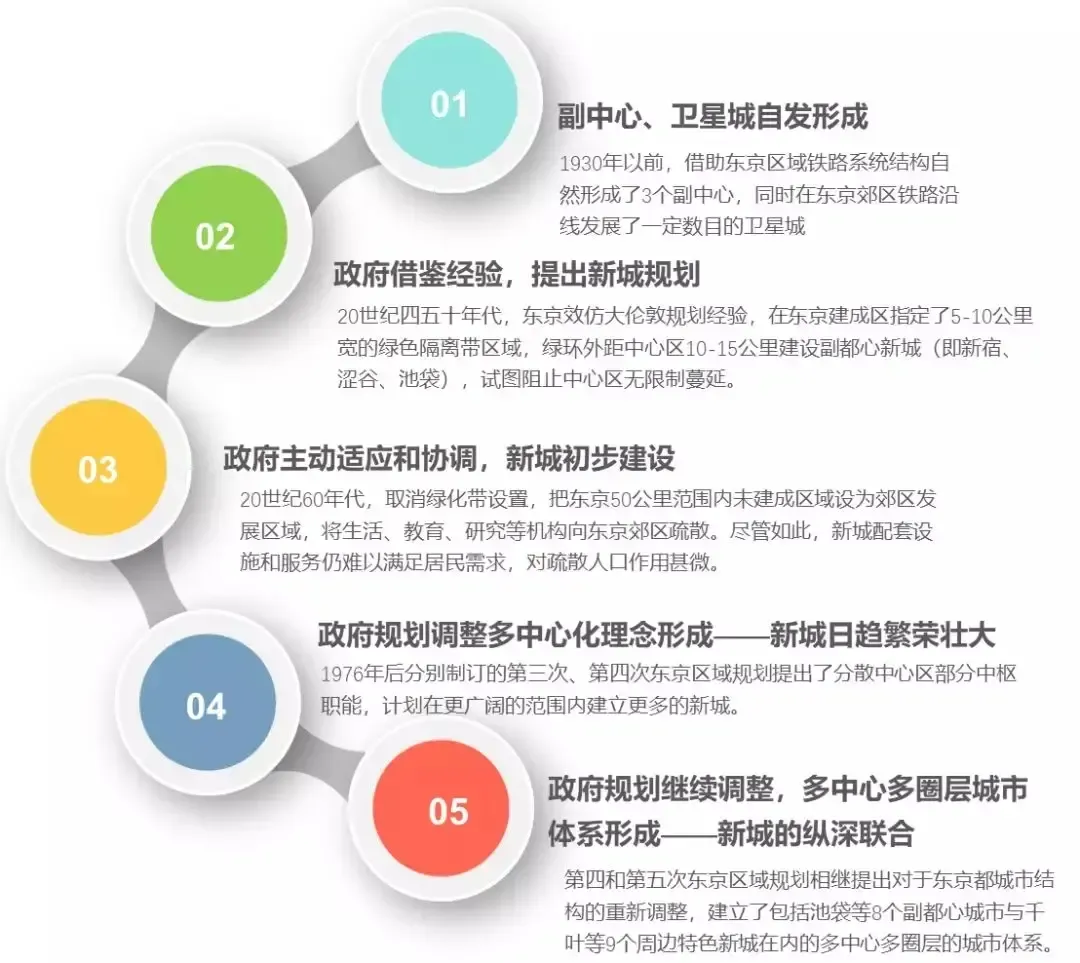 新城从最初自发形成到后期政府主导体现了日本城市规划理念的演变,东京都市圈新城发展大致经历了新城自发形成、新城雏形显现、新城初步建设、多中心化发展、多中心多圈层城市体系形成五个阶段。