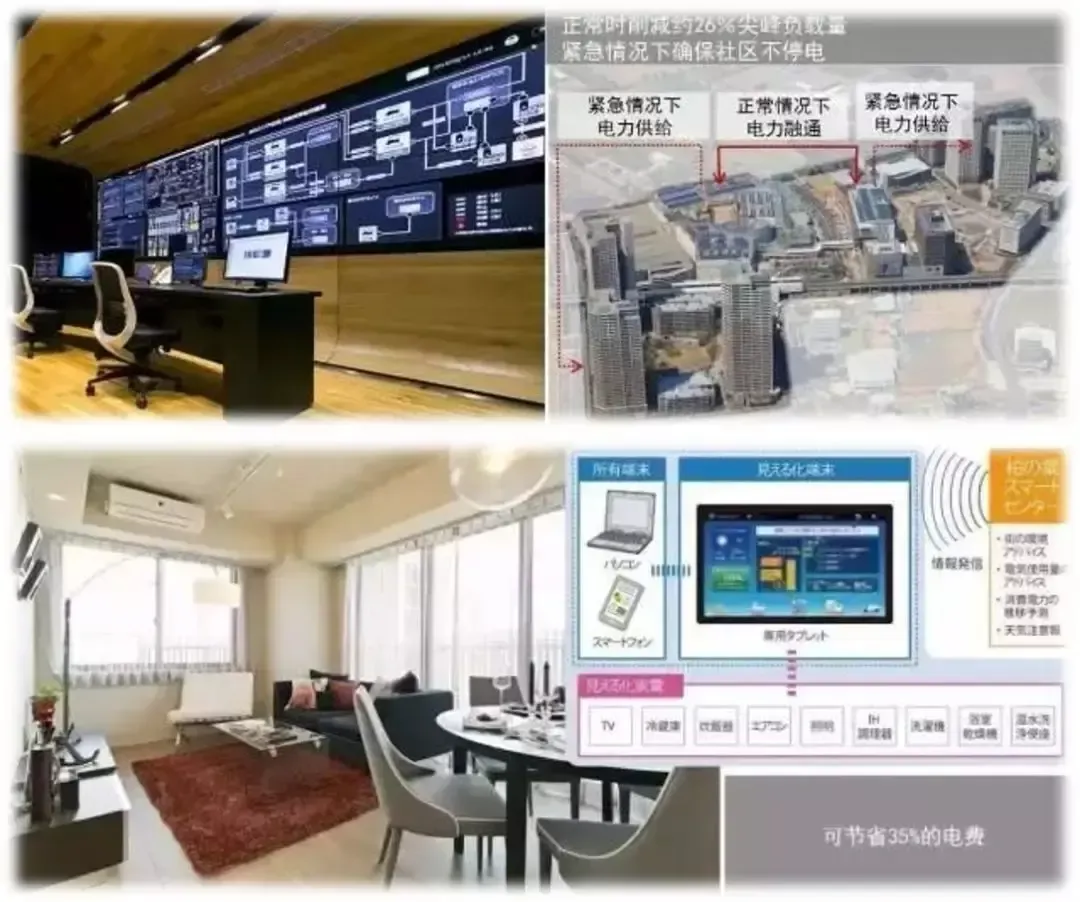 柏叶新城城市智能中心包括区域能源管理系统(AEMS:AreaEnergyManagementSystem)和景观控制系统,在正常时可削减约26%的尖峰负载量,并可在紧急情况下进行地域间的电力再分配。同时社区内多为标准化高级租赁住宅,采用家庭能源管理系统(HEMS:HomeEnergyManagementSystem),提倡节能,可控制空调和照明的用电量,在紧急情况下可以进行电力再分配,确保社区不会停电,同时实现节能、防灾、加强社区内交流等目标。