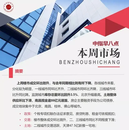 早八点:上周楼市整体成交上扬 土地整体供应环比微降
