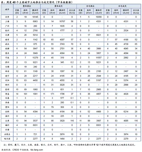 住宅用地推出方面,40个主要城市推出住宅用地67宗,较上周增加4宗,推出面积398万平方米,较上周增加65万平方米;太原推出89万平方米,为推出量较大的城市。成交方面,成交住宅用地60宗,较上周增加11宗,成交面积396万平方米,较上周增加168万平方米;太原成交83万平方米,为成交量较大的城市;住宅用地成交总金额441亿元,较上周增加174亿元,太原收金居前。