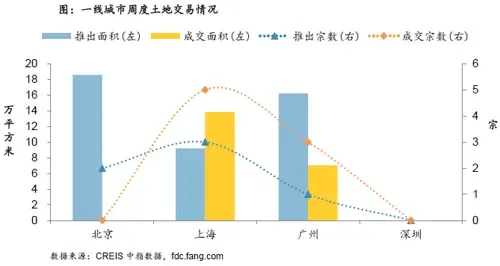 推出方面降逾七成,宅地供应环比显降。一线城市共推出土地6宗,较上周减少18宗,推出面积44万平方米,较上周减少125万平方米、环比下滑74%,宅地供应较上周减少逾八成。成交方面环比下滑,仅上海有宅地入市。一线城市共成交土地8宗,较上周减少7宗,成交面积21万平方米,较上周减少103万平方米,成交总金额62亿元,较上周减少64%。本周,仅上海一城有宅地入市。