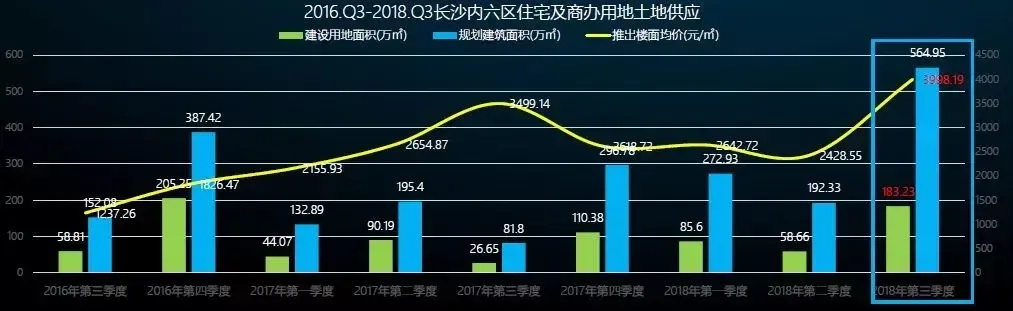 2018年前3季度长沙内六区共推出经营性用地62宗,总供应建设用地面积为327.49万方,环比增加了52.81%,同比增加215.6%。其中,商办用地有23宗,建设用地总面积70.72万平方米,环比增加了54.9%;住宅用地共39宗,建设用地总面积为256.77万方,环比增加58.34%。