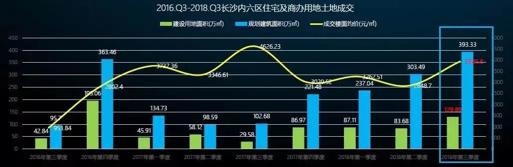 从成交楼面价格来看,3季度长沙内六区土地成交楼面均价是3945.60元/㎡,环比上涨38.51%,同比下降14.71% 。其中,住宅用地楼面均价为4046.43元/平米,环比上涨42.70%;商办用地楼面价均是3308.43元/平米,环比上涨11.98%。