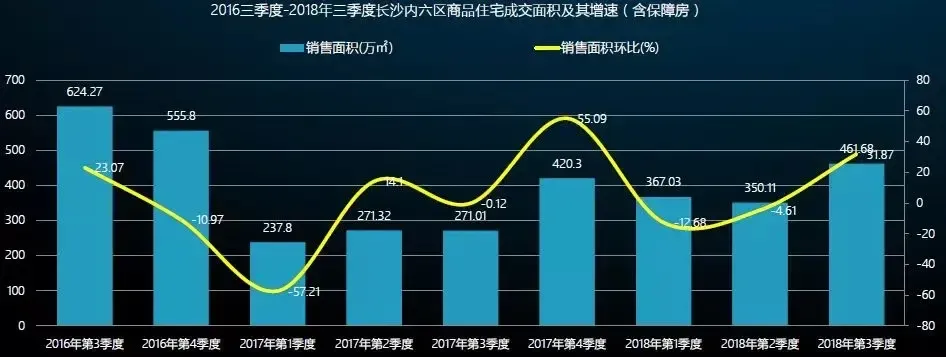 2018年前三季度长沙内六区商品住宅的成交量小幅增长,其中三季度总成交面积为461.68万方,环比增长31.87%,同比增长70.36%。