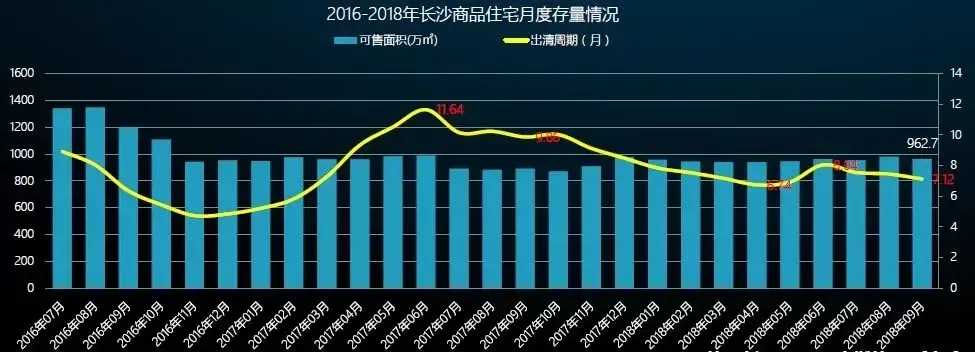 从可售面积情况来看,从2016年开始去库存的势头明显,2018年三季度长沙住宅可售面积基本与去年1月水平持平。截止2018年9月,长沙住宅可售面积为962.7万方。