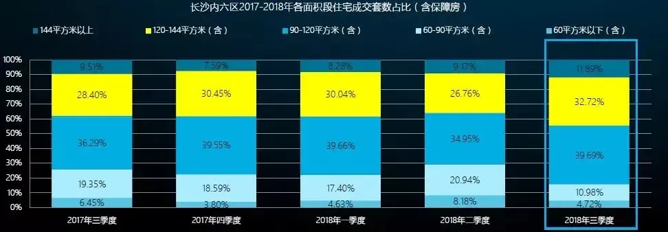 从2018年前三季度长沙内六区住宅面积段成交套数占比情况来看,144平以上的房源成交量逐渐上涨,改善型房源需求有所增加。