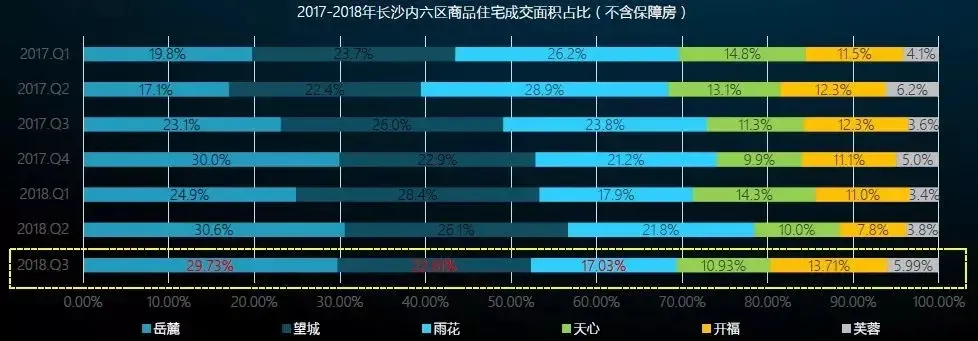 从长沙内六区成交面积占比情况来看, 2018年第三季度岳麓区累计销售131.29万方,占比达29.73%,为六区,较去年同期增长6.63个百分点,为涨幅最快的区域;