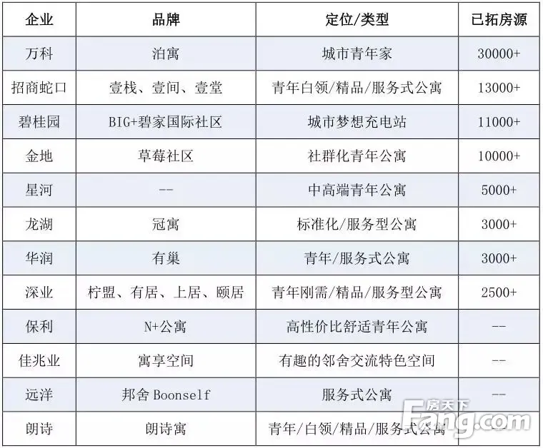 龙湖冠寓:2016年龙湖年中业绩会上,龙湖集团正式对外推出长租公寓品牌“冠寓”。2017年初,龙湖将“冠寓”升级为集团战略性业务,成为龙湖集团在地产开发、商业运营、物业服务之后的又一个主航道业务。截至目前,冠寓也基本完成了一二线重点城市的布局,项目开业城市达到24个,发展势头十分迅猛。