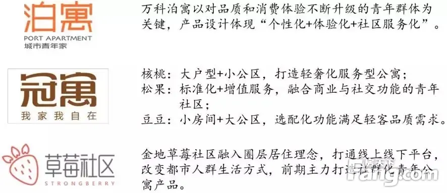 金地草莓社区:金地集团在长租公寓领域分为地产和商置两个条线,分别运作的是荣尚荟和草莓社区。2015年,荣尚荟品牌完成了从服务品牌到公寓运营的品牌外延扩展,推出自在寓、名仕寓、荣尚行政公寓三大公寓品牌,目前在深圳、上海、杭州、苏州、南京、武汉等多个城市运营。2016年,金地在深圳市场正式推出了“草莓社区”品牌,定位为青年公寓。截至目前,草莓社区在深圳、上海、杭州共运营11个项目。