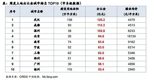 1.出让金:榜单总额增加过半,武汉揽金逾125亿元蝉联榜首