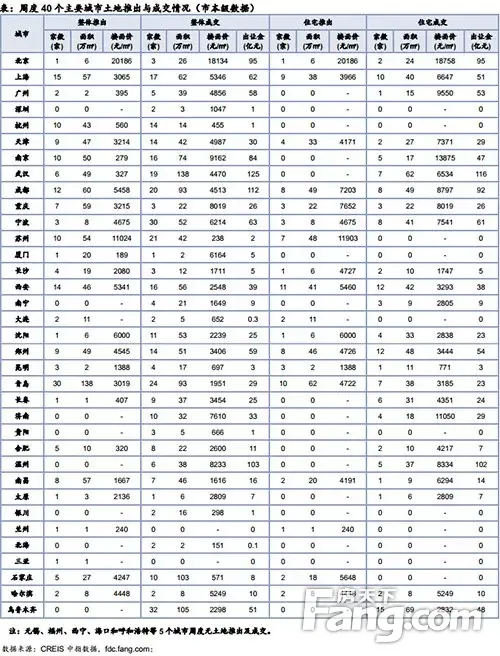 各类用地推出方面,40个主要城市共推出各类土地173宗,较上周减少129宗,推出面积833万平方米,较上周减少442万平方米;青岛、成都推出量较大。成交方面,40个城市共成交土地335宗,较上周增加158宗,成交面积1336万平方米,较上周增加472万平方米;武汉、乌鲁木齐成交量较大。40个主要城市成交总金额1100亿元,较上周增加401亿元,武汉出让金居前。
