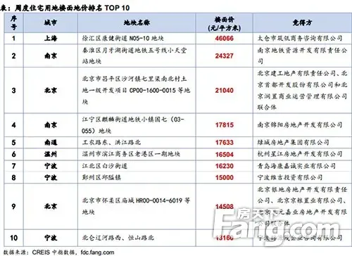 宅地单价榜单均价较上周增加近两成,入榜地块分布集中,长三角地区共有8宗宅地上榜。上海徐汇区康健街道N05-10地块被金地集团以楼面价46066元/平方米揽入囊中,高居榜首,南京秦淮区宅地以楼面价24327元/平方米由南京地铁集团竞得,位居次席。