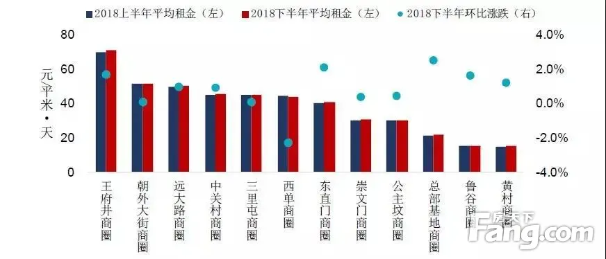 图:2018下半年北京商圈(购物中心)租金及环比涨跌