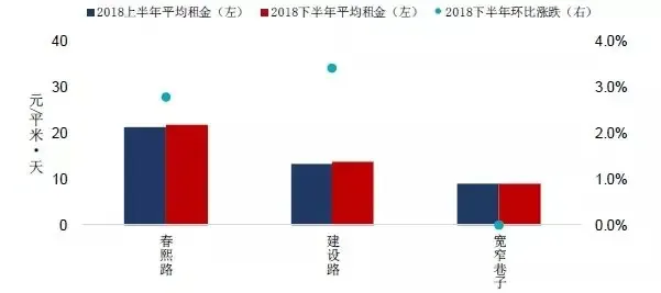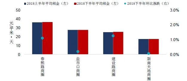 根据中房指数系统中国商铺租金指数对重点城市主要商业街商铺租赁样本的调查数据,2018下半年,成都重点监测的3条商业街中,建设路和春熙路租金较上半年均上涨,环比涨幅在3%左右;宽窄巷子租金与上半年持平。从租金值来看,春熙路租金在20元/平米·天以上,仍位列各商业街首位;建设路和宽窄巷子租金相对较低,均在15元/平米·天以下。