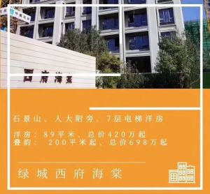 石景山区,新房推荐 500米内人大附中、24万平米商业、三甲医院 洋房: 90-135平米三居四居,420万-685万起; 下跃: 3.8米台地下跃698万起