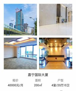 嘉宁国际大厦 办公室出租,200平方。 租金4每月。4个经理室20个工位 欢迎房东和客户委托石大军(温暖如家房产)