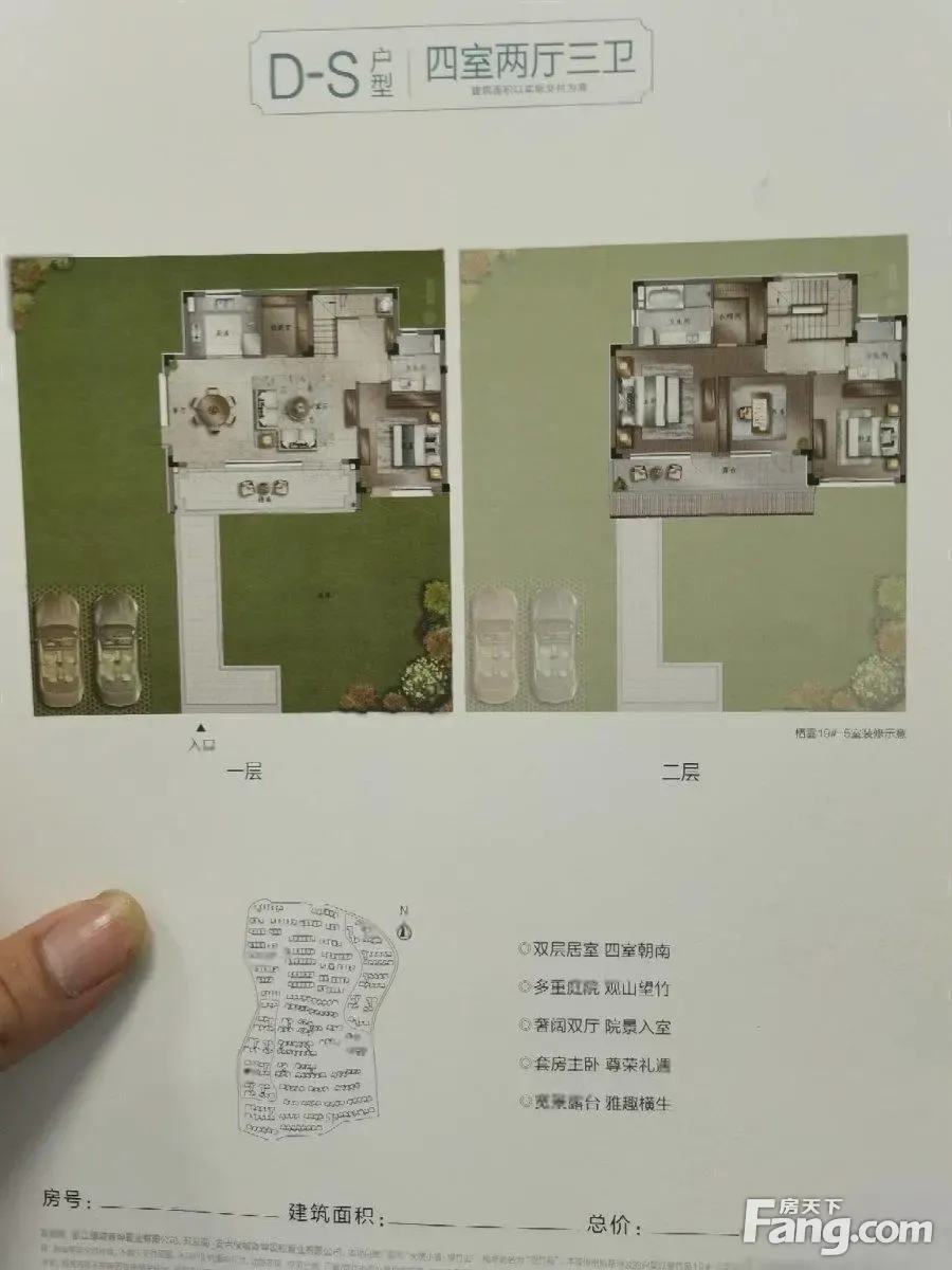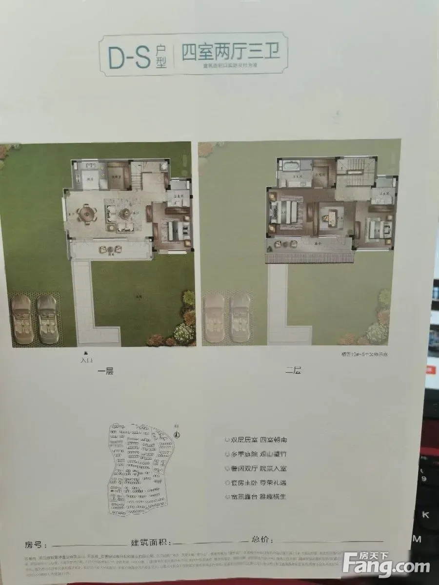 地上两层:独门独院,赠送车库 户型:四居室 居室:3室2厅3卫 面积:135.68平米(建筑) 户型点评: 【特色】该户型为大花园户型,三面采光取景,餐客一体通厅,动静离。 一楼:餐厅客厅卫生间+老人房,可庭院 二楼:双次卧朝南,大主卧套房+卫生间+衣帽间+书房+露台。近可赏庭院美景,远可观群山旖旎。