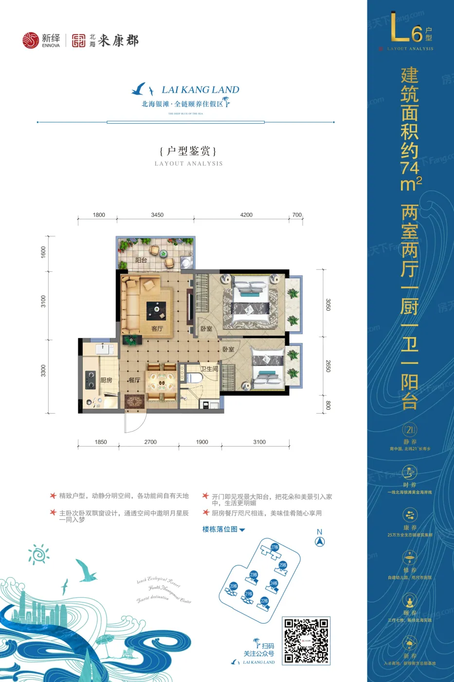 【推荐理由】北海·来康郡社区内配置三疗健康管理中心,七修健康生活体验馆,将生命健康理论和三济抑熵疗愈体系深入到家庭生活的每个细节,由信息医学、能量医学、生物医学组成的评估、干预、康复体系,配备完善健康的健检设备,致力打造符合健康需求的生活环境。在外将24公里原生沙滩私人臻藏,冠头岭国家森林公园、红树林自然景区为生活提供充足鲜氧。社区内以1.7(一期)的超低容积率保证社区空间更加舒适。