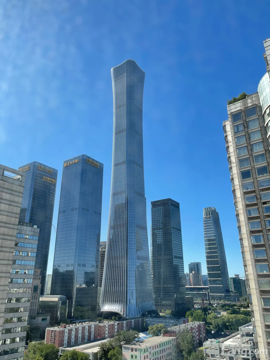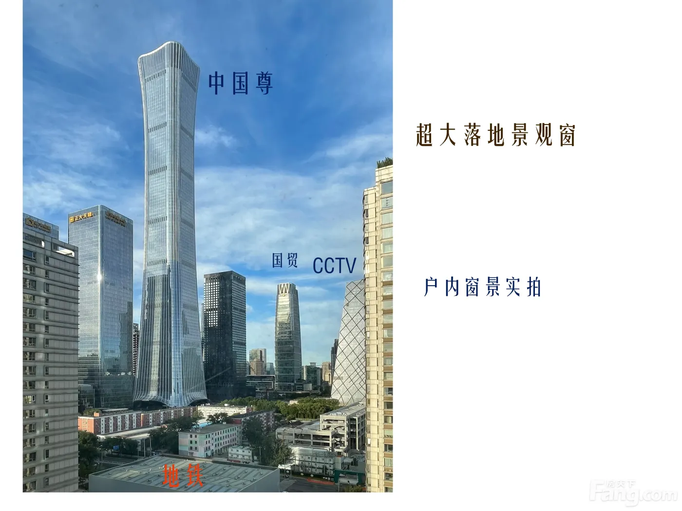 说说房子 正面中国尊,中央电视台旁。楼层优越,视野开阔。20层楼高度,静谧开阔舒适。超大落地景观窗,CBD朝云晚霞,活力繁华尽收眼底。整个户型所有房间全天日照充足明亮。美式平层,框架结构设计,空间灵活划分。现房分割为三室二厅二卫。70年产权住宅。 说说小区 小区纯住宅封闭式管理,人车分流。电梯主、客、货物分离。周边交通出行便利。中国尊地铁站即将开通。对面高端配套商场娱乐休闲,SKP新光天地,万达影院,金地购物商场,沃尔玛超市,文化馆等。附近幼儿园、小学、中学、大学、老年大学和文化娱乐生活娱乐配套成熟丰富。