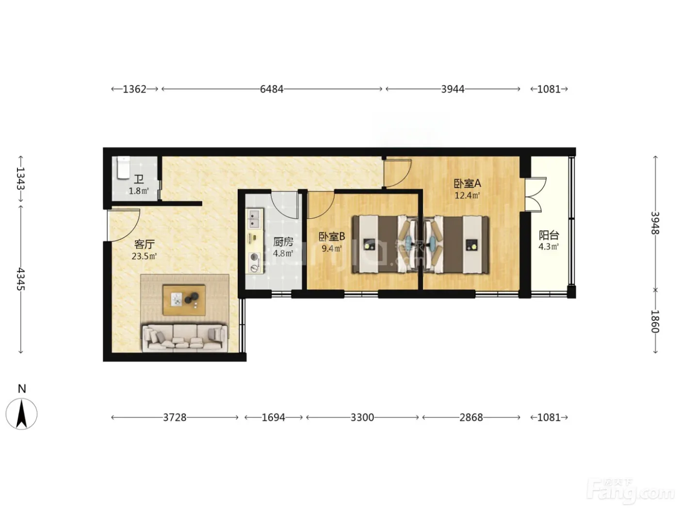 整体动静分区合理。客厅面积为23.5㎡,满足家庭公共活动需求。2个卧室设计合理,主卧全天时段采光好。次卧朝南,全天阳光充足。厨房布局方便,可容纳多人同时使用。户型内有1个阳台,可供储物和晾晒。 卧室A的面积为12.4㎡,面宽3.1m,进深4.1m,可以容纳床、双床头柜和衣柜,具备较大的布局灵活性。采光为南向,阳光充足,能在白天大部分时间接收到自然光。窗地比为0.3,窗地比适中,光线相对柔和舒适。卧室A有一个4.3㎡的阳台,阳台进深为1.3米,可以放置休闲桌椅,在阳台观景或阅读。 卧室B的面积为9.4㎡,面宽3.4m,进深3.0m,能放置下床和衣柜,采光为南向,阳光充足,能在白天大部分时间接收到自然光。窗地比为0.2,窗地比适中,光线相对柔和舒适。 厨房的面积为4.8㎡,面宽为1.9m,可容纳多人同时使用。面宽进深比为1:1.6,厨房的形状较为方正,面宽和进深比例均衡,适合采用U型的台面布局,充分利用墙面及拐角空间,保持做饭的动线流畅。厨房南面有窗,为明厨格局。