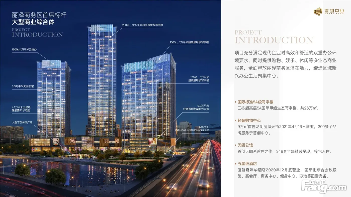 首创中心办公楼90平至11076平现房出售丽泽SOHO 土地用途:商业、办公 占地面积:12.5万㎡ 建筑面积:51.7万㎡ 出售面积:11075.5㎡(33F~37F) 单层面积:2215.1㎡(每层12个独立产权,可分售) 开间面积:90㎡、120㎡、150㎡、300㎡、450㎡、600㎡、750㎡、1000㎡、 出售价格:5.5万~5.8万/㎡、 付款方式:全款或按揭 交付标准:毛坯 总层数:地下4层,地上37层 标准层高:4.5米 使用率:75% 物业费:36元/月/平米 车位数量:1800个 车位费:1200元/月/个 空调:VRV中央空调系统 电梯:办公低区3部;高区3部 保安消防:24离线式巡更系统、24电视监控系统、 消防:配备国内知名品牌火灾自动报警系统、消防排烟系统、自动喷洒灭火系统、消防联动系统、应急事故广播系统、室内外消防栓系统等。 通讯设施:手机无线信号覆盖整栋大厦,宽带接入, 项目介绍 首创中心位于西二环菜户营桥西500米路南,丽泽金融商务区的核心位置,项目北至丽泽路,南临中国戏曲,西至金唐国际金融大厦。项目由四栋超高层楼栋组成,规划总占地12万平米。首创中心作为丽泽金融商务区首发门户综合体,项目总建筑面积52万㎡。涵纳25万㎡纯国际甲级写字楼、9万㎡新生代体验型购物 、4万㎡五星级酒店、及4万㎡办公空间。多元复合业态,充分满足当代企业对办公环境高效和舒适的双重需求,并以购物、娱乐、休闲等全系商务、生活服务体验,矢志营造丽泽生态商务综合体。首创中心F05号楼,命名为首创天阅公馆,是整个丽泽金融商务区南区700万平米中可售型的产品,楼栋建筑总高度150米,整体规划为地下4层,地上37层,楼宇外立面为石材,搭配流线型LOW-E单元式玻璃幕墙,大堂全石材非毛坯。其中F17层以下为五星级 酒店。F18—F37为本项目,大堂主入口与酒店入口完全分开,并设有无障碍设计,避免了彼此交叉干扰。大堂全石材精装,配备多部进口高速电梯,高低区分区使用,使您平均等候电梯时间小于30秒。小面积户型精巧实用,中大面积户型采光舒适,张弛有度。