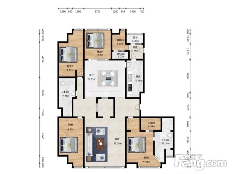 户型齐全,主打南北通透,户型方正,全明格局,干湿分离四居