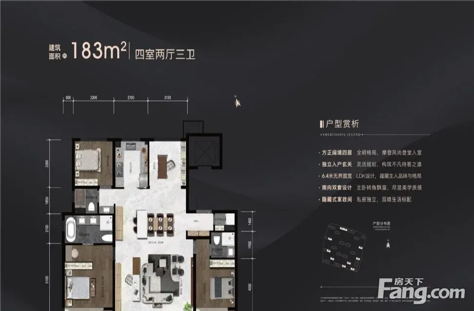 户型解读 招商玺共规划22栋住宅楼(8-22层),户型面积:户型有-260平,户型配比依次为35%、35%、25%、5%。:143户型3米,3.1米两种,183户型3.1米,物业费:8.98。228-266户型3.15米整个小区约972套房源,部分房源现房销售,交付时间2026.12月。项目位于亦庄河西板块,也是继望京之后,近几年配套落地多、、品质的板块之一。北京+龙湖天街+规划儿童医院+地铁S6线,北邻南海子公园,整个板块宜居。房屋拥有相对宽松的尺寸,布局通透,动静分离,设计豪华