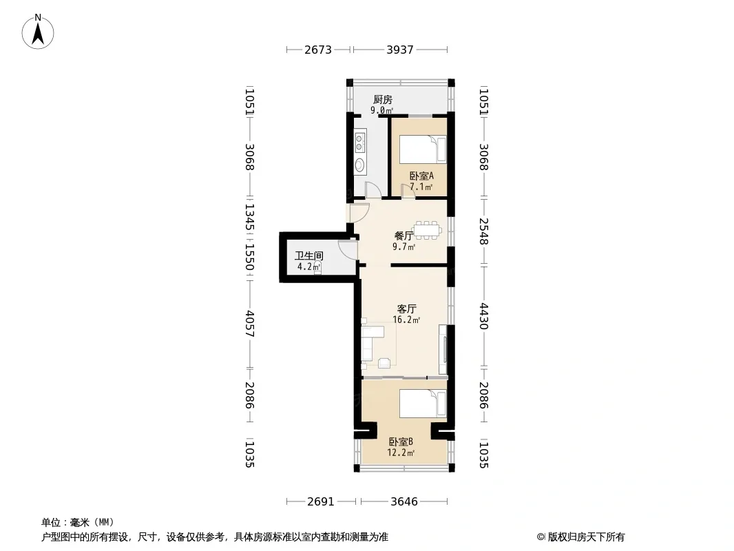 1 超经典的两居室户型 采光俱佳 南北通透两个卧室 2大客厅 在中间让居住者充分享受阳光的惬意,南北各一个卧室的设计让通风效果达到最优