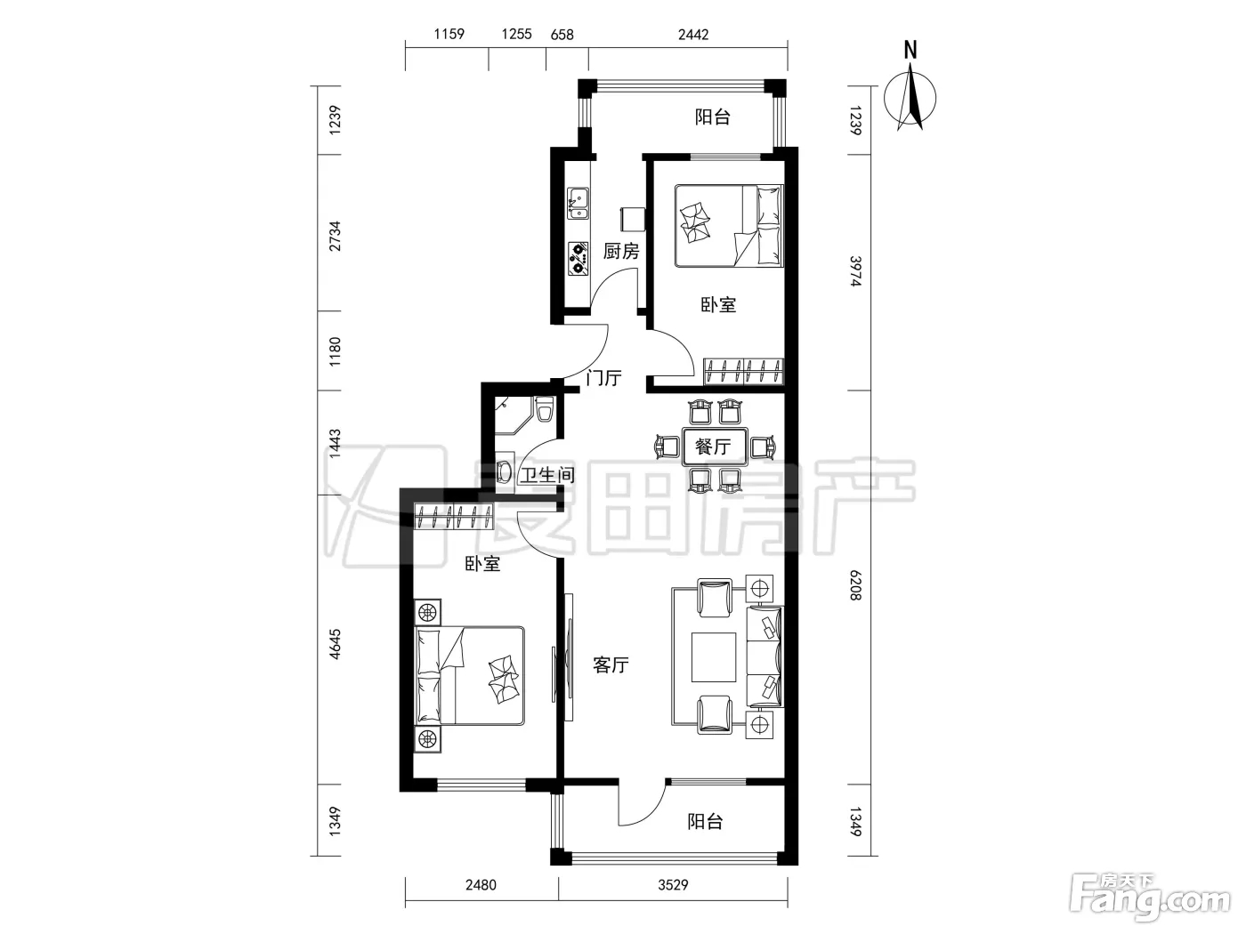 户型齐全,主打明卫,明厨,双卧朝南,主卧朝南二居