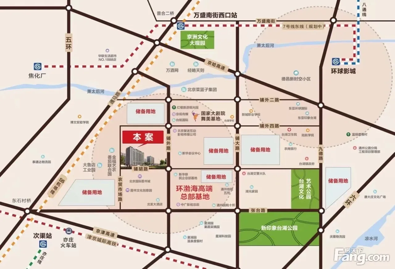 通州被定位为北京,尊享城级公共资源。距近65亿美元打造在建的环球影城3.5公里,闹中取静,适中。高速路网:2公里上高速,4横3纵干线路网,四通八达出行方便。轨道交通:3公里上地铁,现有八通线、6号线,亦庄线、在建中的地铁7号线,规划中的S6号线。