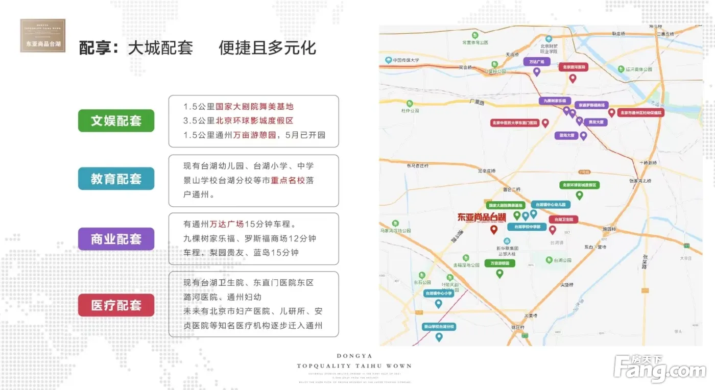 【配套资源】:北京新城职业,为业主子女提供的平台,铺平學业之路;:台湖集贸市场、物美、世纪联华;生活:台湖卫生院、北京农商银行、邮政储蓄银行; 【交通出行】:项目交通畅达,北距京哈高速约公路1,南距京津高速公路4,东距六环2.8。公交线路:通7路、通11路、通15路、976支路,通7路台湖东口站下,976支路台湖