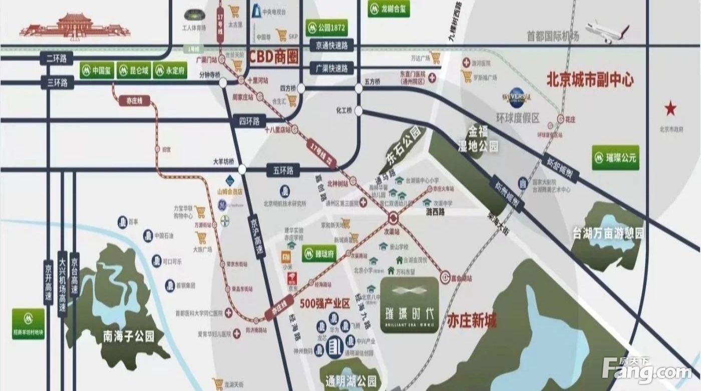 小区配套 【教育】景山xue xiao、北京小xue、北京八中 【医疗】亦庄同仁三甲医院、北京爱育华妇儿医院、通州第三医院等,为健康保驾护航 【商业】亦庄山姆会员店、大族广场、亦庄龙湖天街、信创园商业中心等 【环境】紧邻通明湖公园、嘉会湖湿地公园,尽揽超百万方绿色生态大境 【交通】 三横:东五环、东六环、通马路快速通达国贸、通州城区、亦庄核心区; 三纵:京哈高速、京津高速、京沪高速快速衔接内外城, 五轨道:地铁17号线、亦庄线、京津城际高铁、T1、S6线