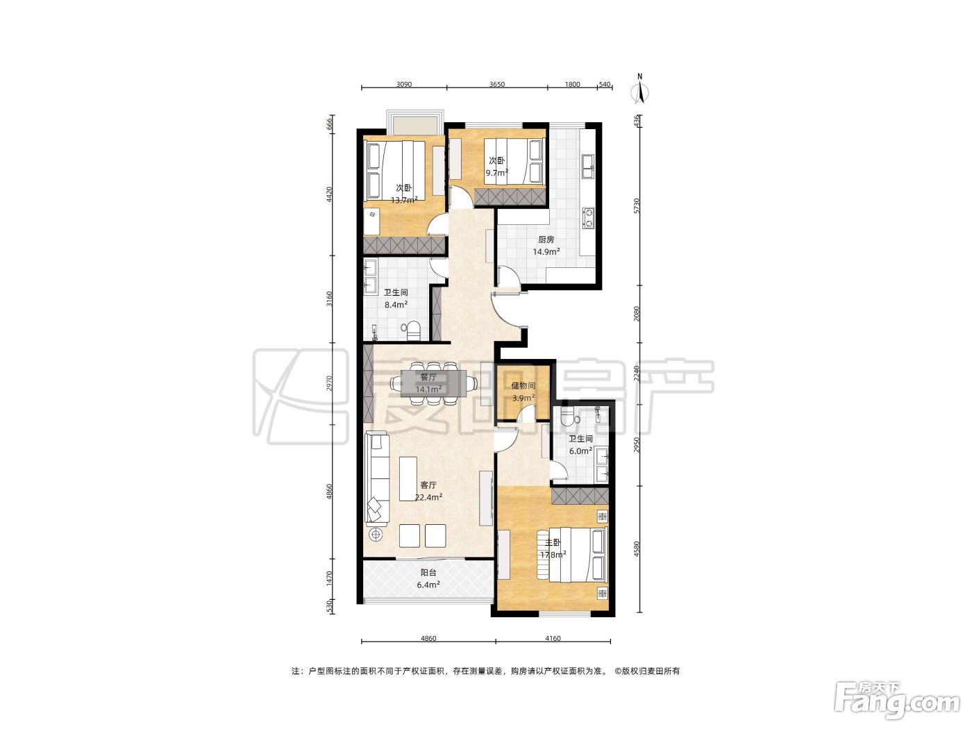 主卧客厅朝南,两个次卧和厨房朝北,南北通透客厅带一个6.4平的外置阳台,客厅面宽4.8米,主卧面积17.8平,北向大次卧13.7平,次卧9.7平L型厨房大约15平