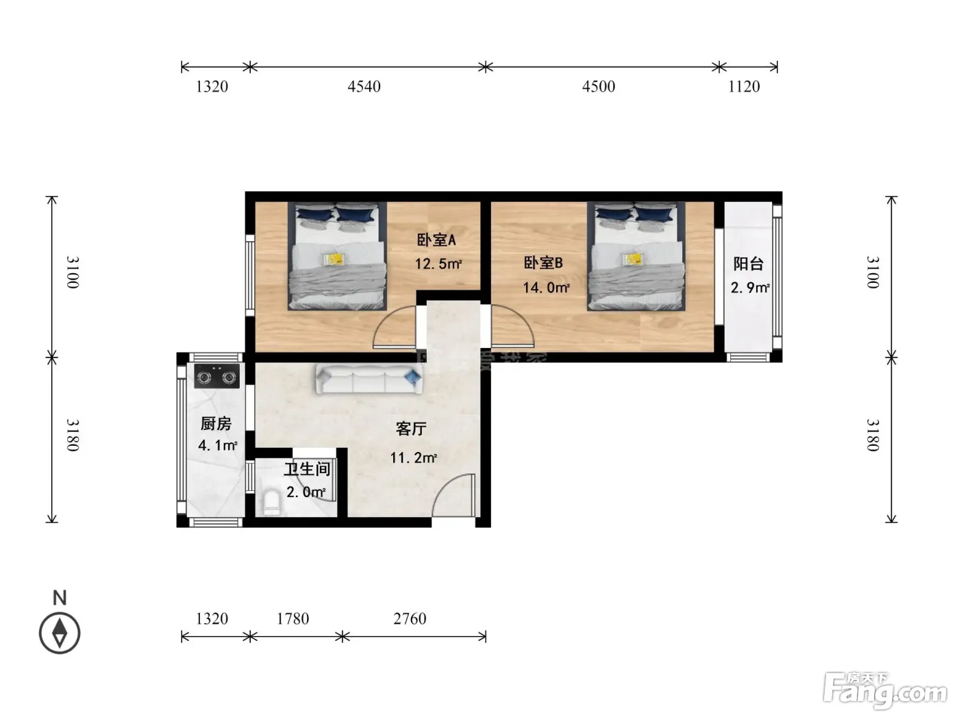 户型介绍:此房东西向 61.38 二居室