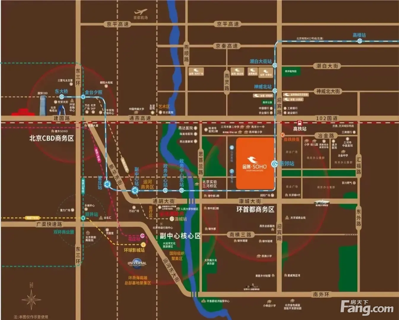 周边交通: 社区门口迎宾路对接102国道直通北京,京秦高速对接北京东六环、京平高速对接北京首都机场,交通四通八达,进京非常方便。距离修建中的地铁22号线潮白大街站1公里,已经动工建设,将于2025年完工投入使用。 医疗配套: 燕达国际医院、誉美肾病专科医院、 三河市燕郊人民医院、三河市燕郊二三医院、京东中美医院。 公园配套: 燕郊植物园、燕郊滨河森林公园、梦东方未来世界、燕郊体育公园。 社区内部四大景观区: ①绿篱式围墙 ②小区门头 市政游园 ③社区内部园景设计及分区 ④社区园景建成展示