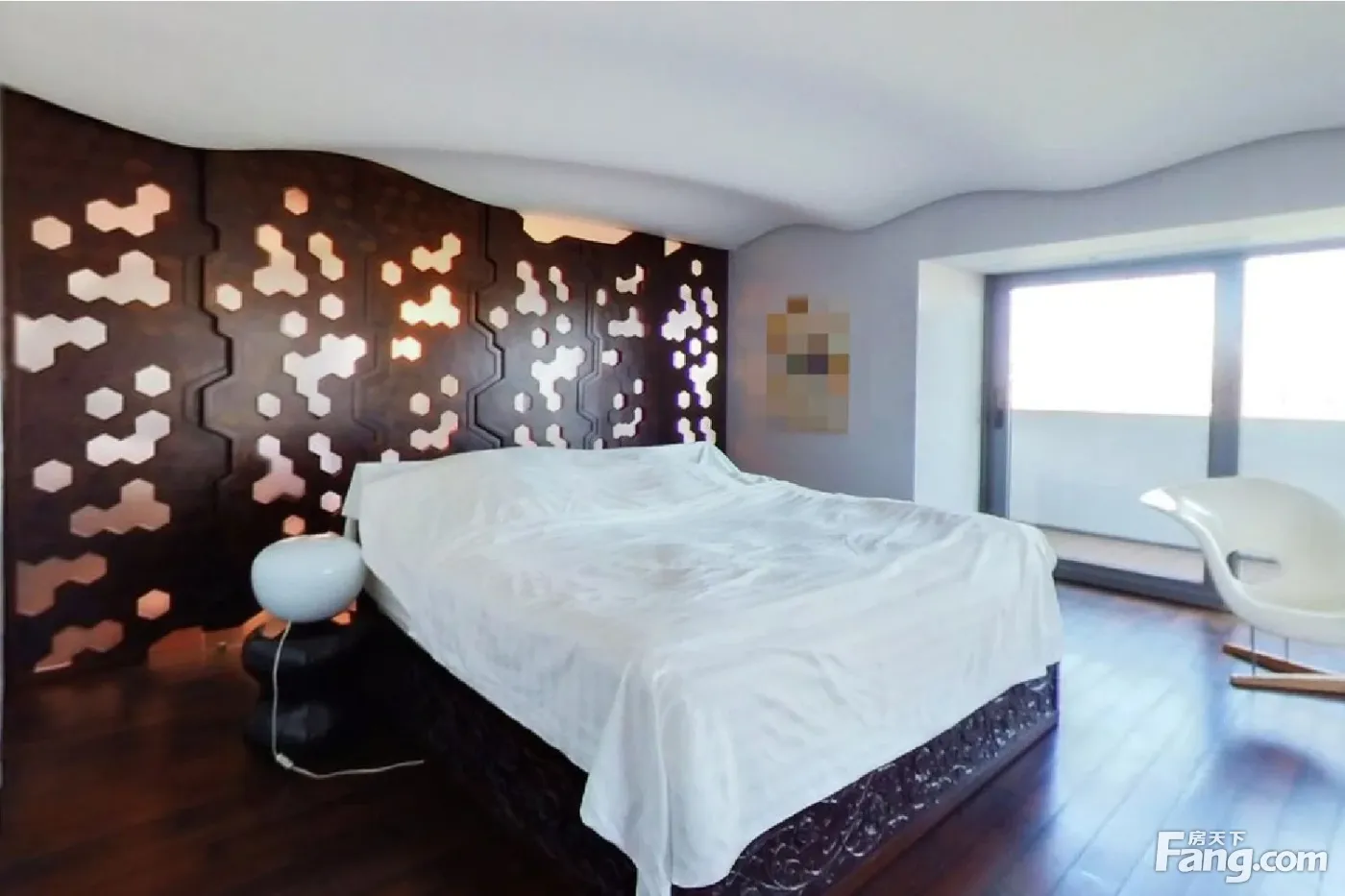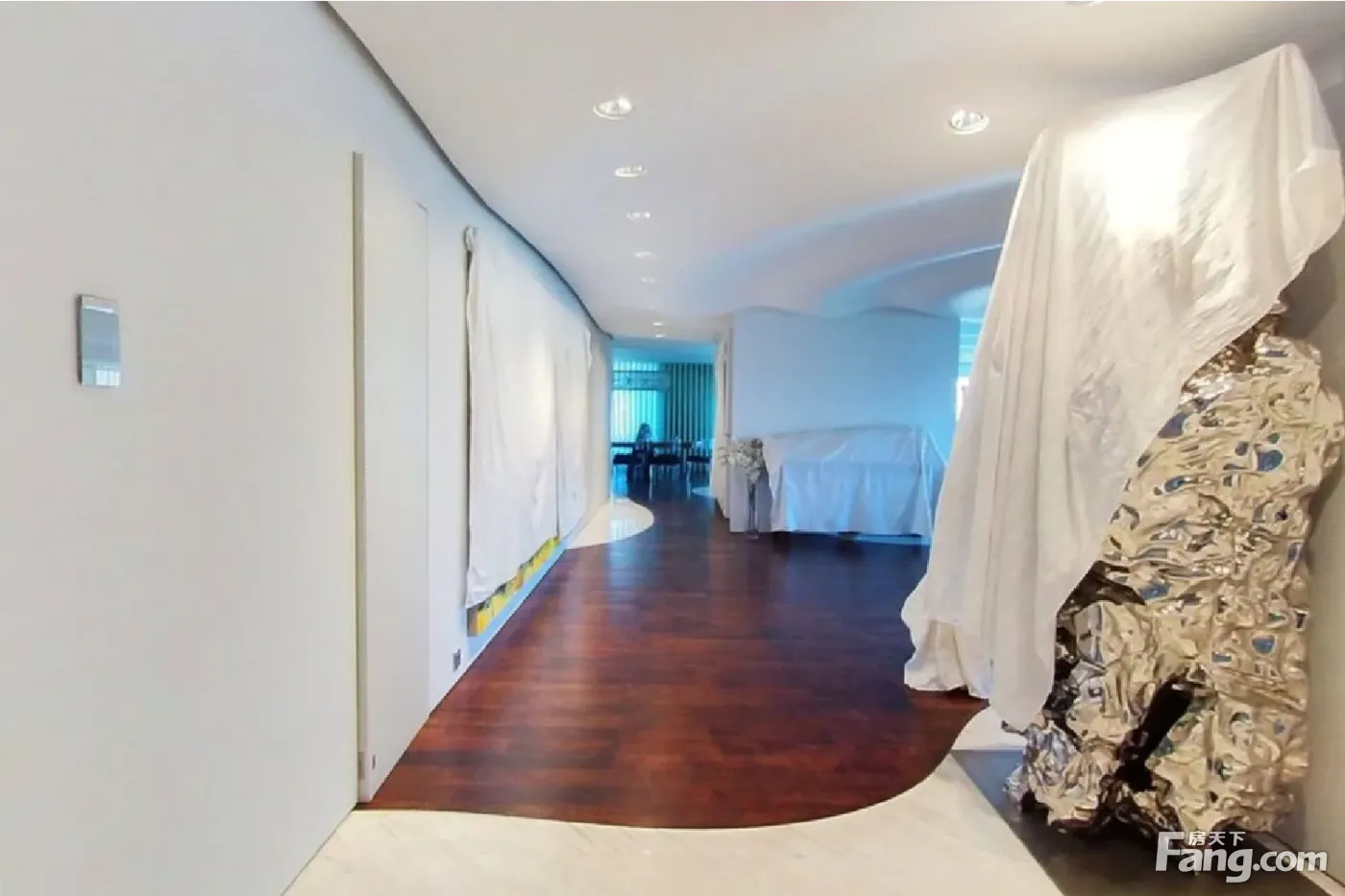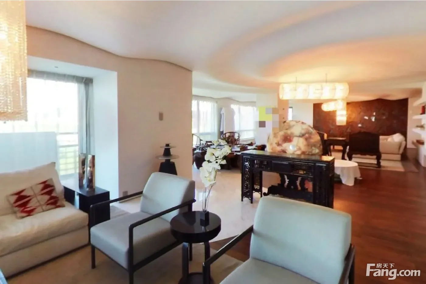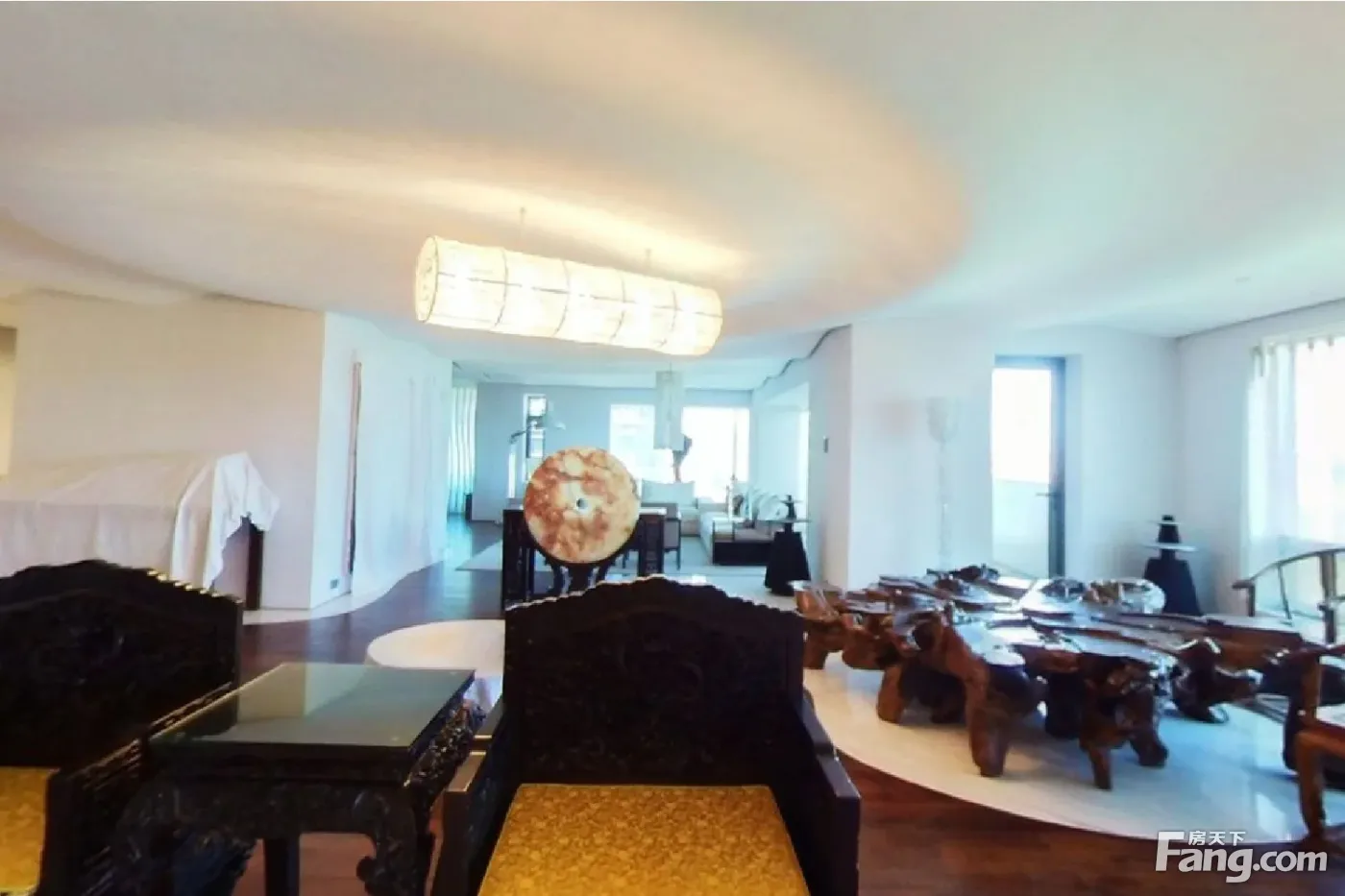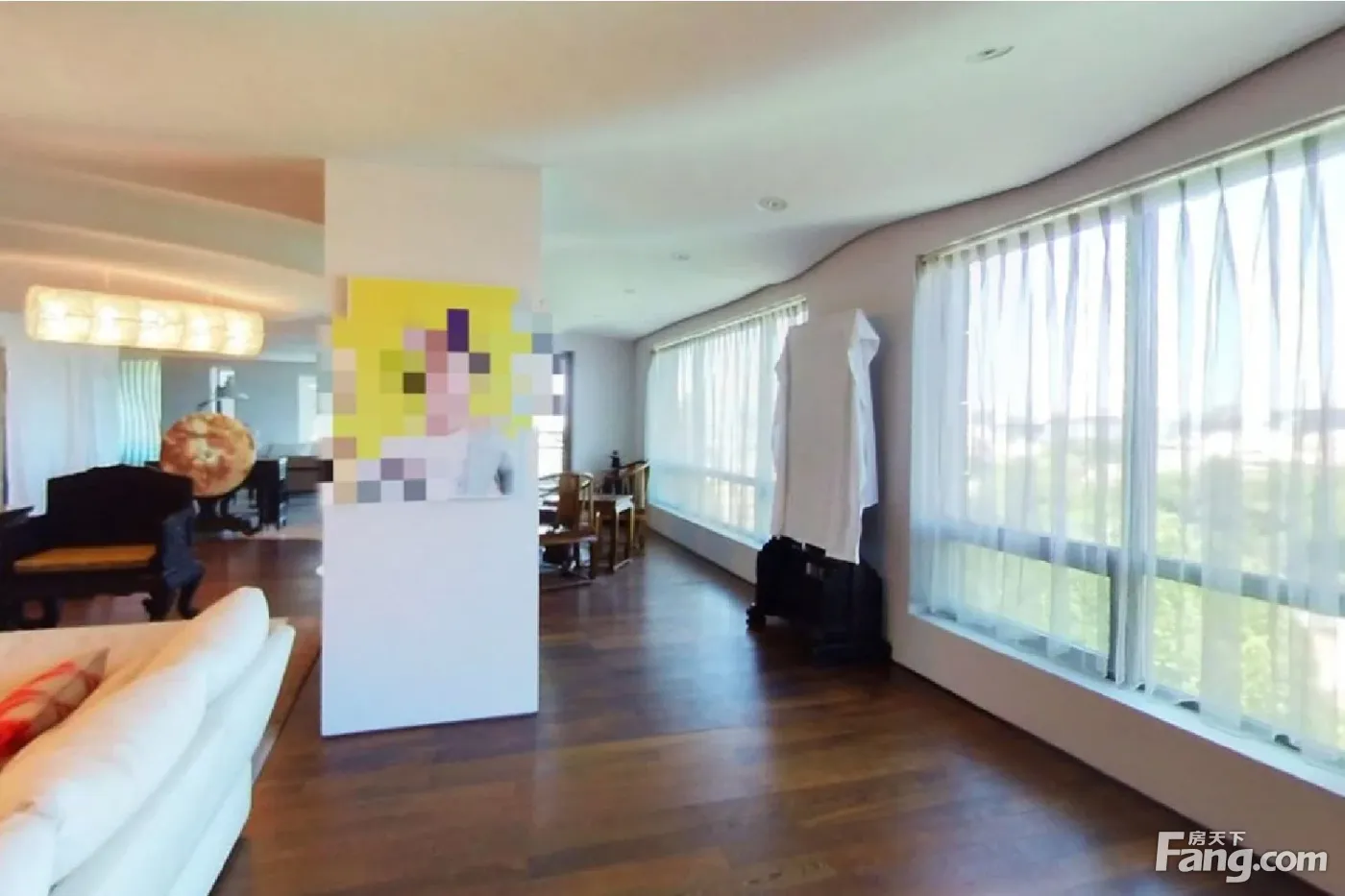 户型描述 本房608.75平,2室4厅3卫,舒适落地窗设计,有影音室、保姆间、洗衣房,东西北三面采光,北向面宽30米,东、西向面宽20米,拥有非常开阔的视野角度。 1、北和西三个空间打通连接成110多平,居家、会客都能满足。 2、西向52平大餐厅可容纳至少十四人用餐,20平大厨房,中间带岛台。 3、东北向46平大主卧,带12平大衣帽间和15平大主卫,东和北两面落地窗,北观3万平南馆园林。 4、东向27平大次卧,带8.4平卫生间。 景观特点 1、北观3万平南馆园林,北向800米内无任何视野遮挡,绿意萦绕,远眺到盘古大观。 2、西望西山连绵山脉,感受西山的灵气,让思绪飞扬。 装修特点 1、业主毛坯购入,2007年精装修,全屋定制化设计,非原始开发商精装格局。 2、超现代主义风格,简约白色为主题,水波形屋顶设计,地面实木地板,脚感柔和,主灯+筒灯结合,现代艺术空间感。 3、定制入户门,精选的艺术摆件、墙上的画等与装修风格非常匹配,增添了整个房屋的艺术氛围。 保养状况 1、房屋保养几乎全新,业主常年住香港,2007年装修完前期偶尔来北京暂住一下,后来一直闲置。 2、每周北京公司这边员工都会来一次房子里,做保洁和保养,房子保养堪称样板间。