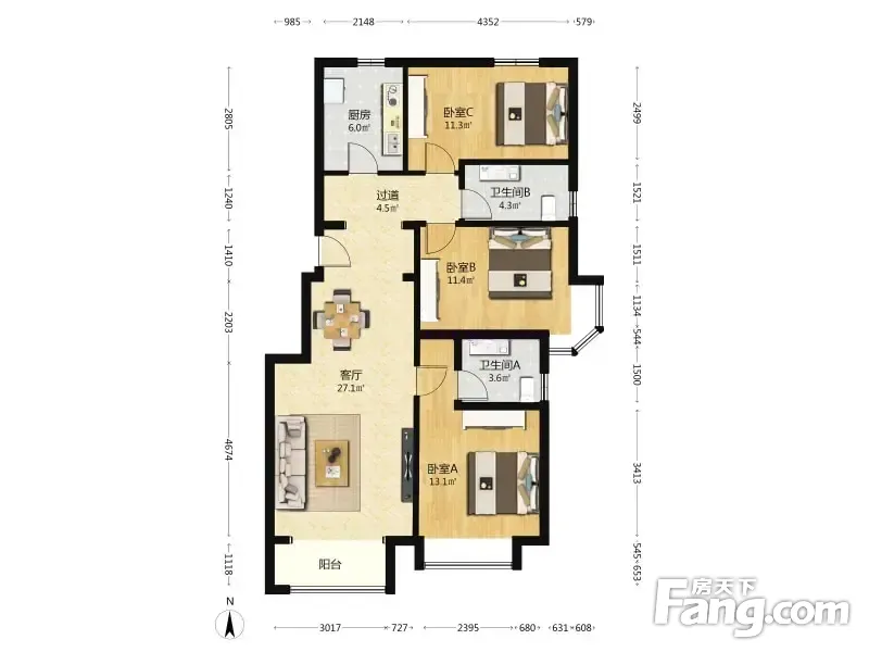 户型齐全,主打南北通透,主卧带卫,干湿分离三居