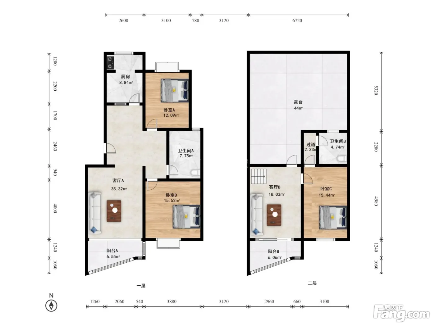 户型介绍:房子是2004年建成,一层是正规南北通透的两居户型,朝南的主卧和客厅,客厅带有阳台,次卧和厨房朝北,厨房有北向阳台,楼上二层客厅和卧室朝南,楼上和楼下都有卫生间。
