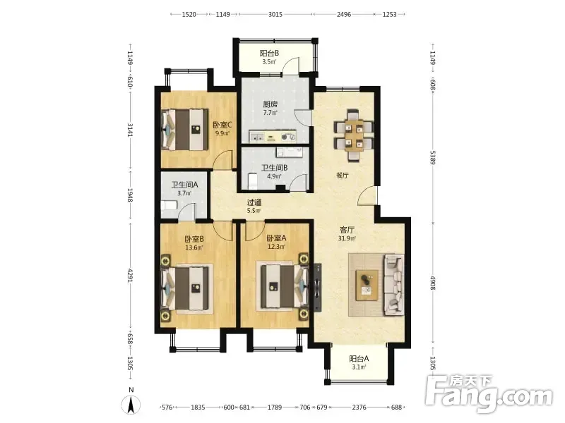 富锦嘉园一区 南北双通透双卫三居 带 中层 户型方正