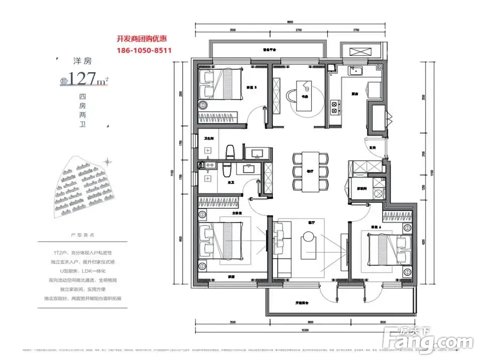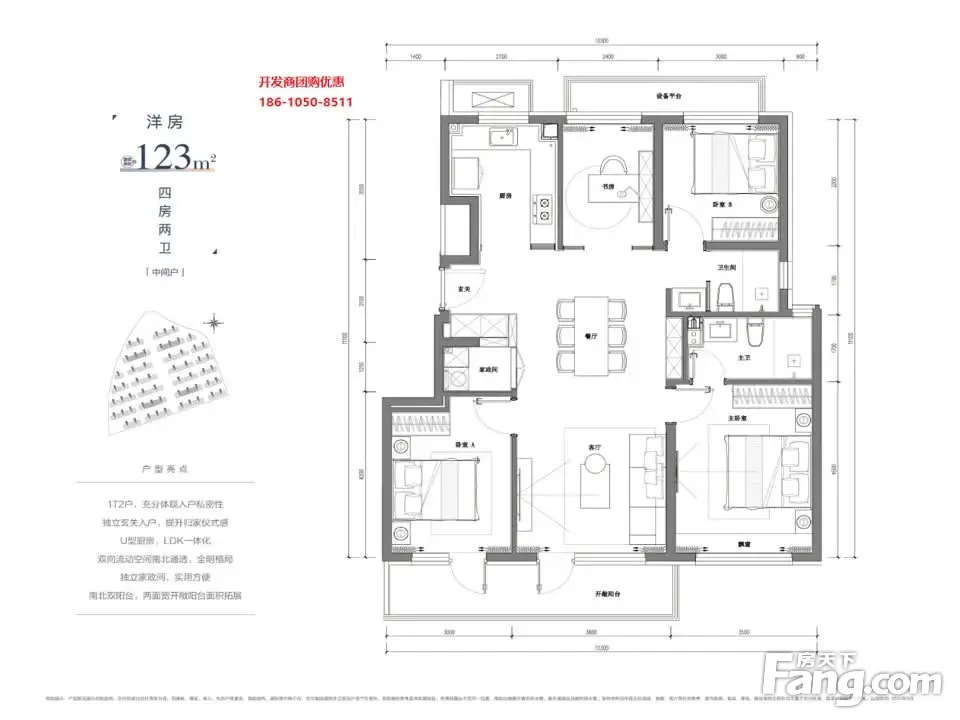 户型齐全,主打南北通透,全明格局,采光充足,客厅朝南,主卧套间,U型厨房四居