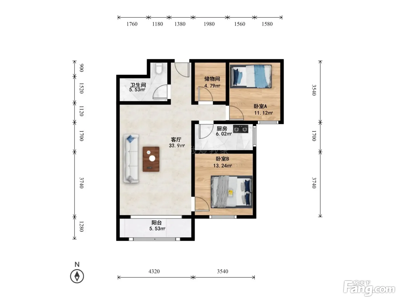 户型介绍:此房为南向两居室,三面朝南,客厅南向带阳台,采光充足,户型方正,浪费面积少,居住舒适。
