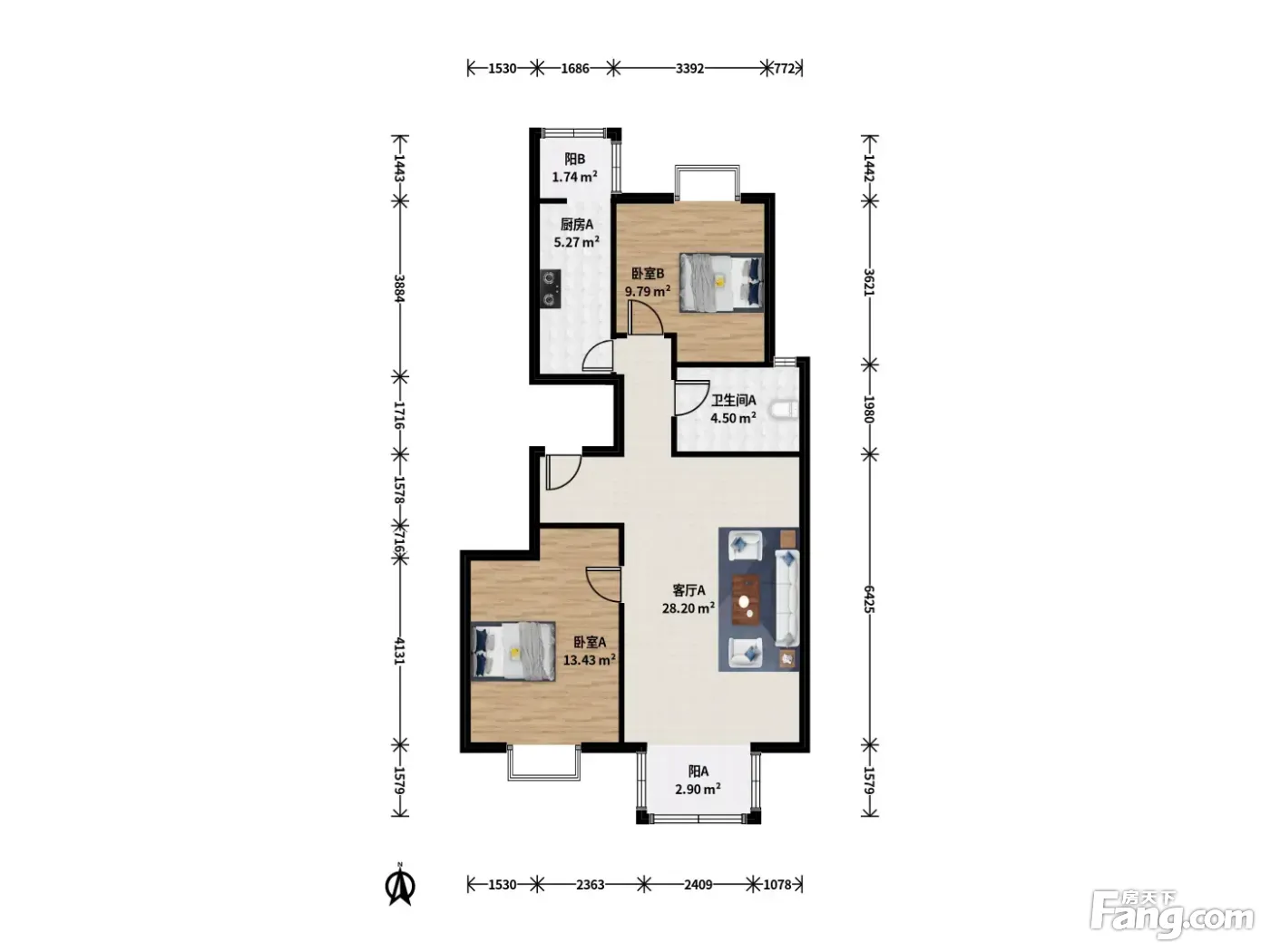 户型齐全,主打明厨,客厅朝南,双阳台二居