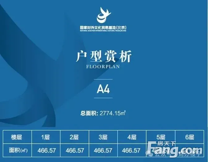 项目名称:?国家对外文化贸易基地 出售面积:A4楼企业独栋(2774.15平米) 出售报价:2.3万元/㎡,可谈 交付状态:现房交付 位置:位于国家对外文化贸易基地西侧。 面积:总面积2774.15平米,共6层。 亮点:零公摊,顶层带有天井为面积。 层高:首层5.4米,标准层4.2米。 承重:首层承重350公斤/平米,标准层承重200公斤/平米。 电量:300