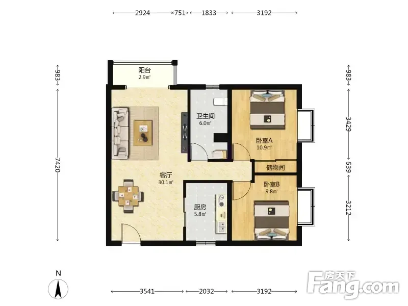 户型齐全,主打明厨,独立衣帽间,双卧朝南,主卧朝南二居