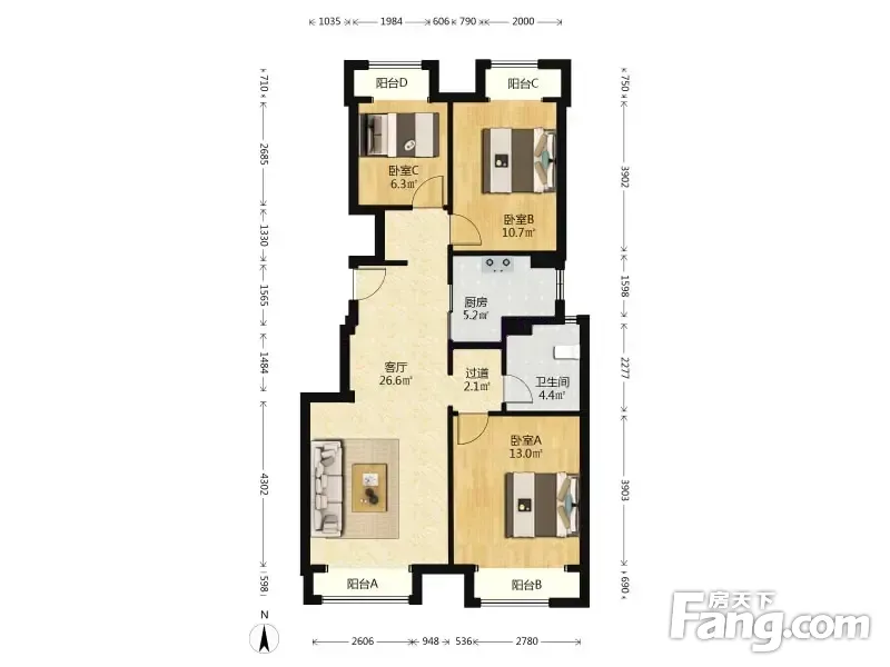 户型齐全,主打户型方正,明卫,明厨,双阳台,客厅朝南,主卧朝南三居