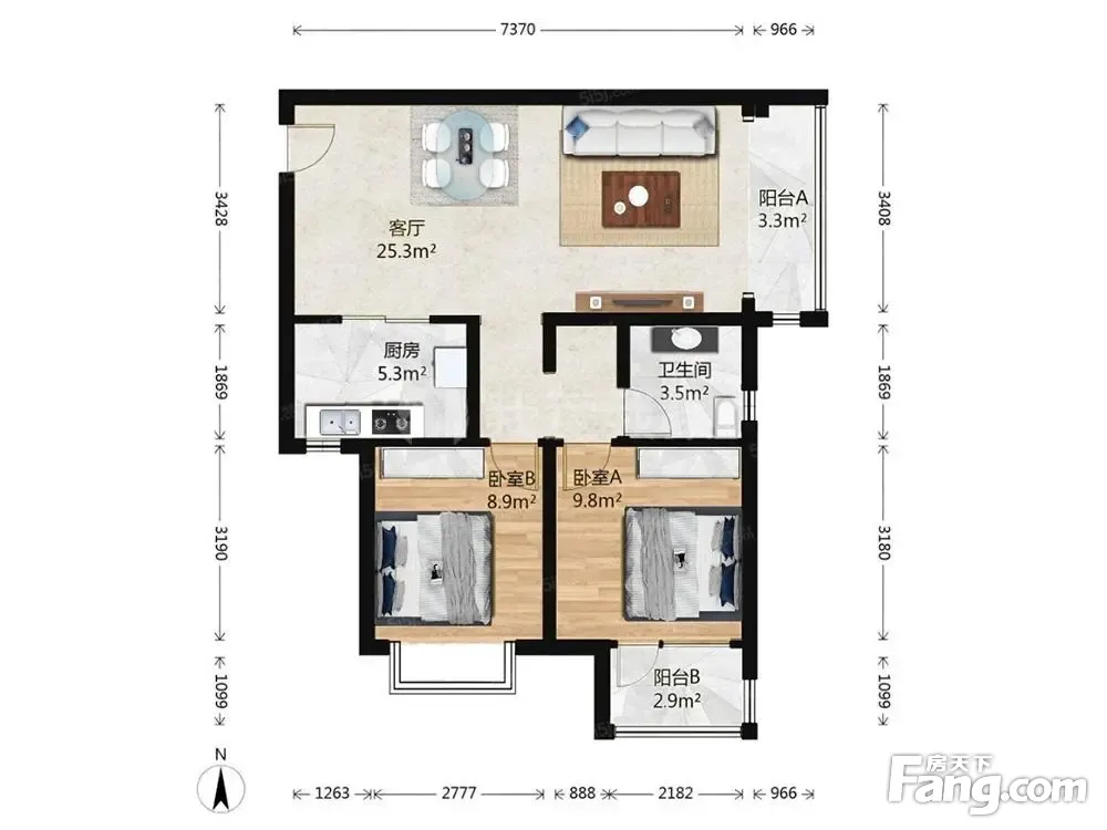 户型介绍:此房户型为2室1厅1卫,建筑面积为88.85平米,朝向为东南。