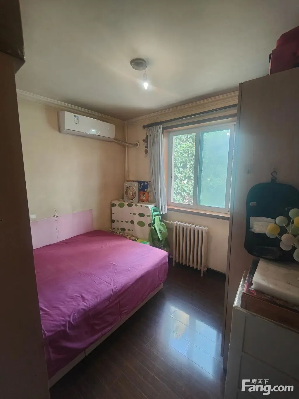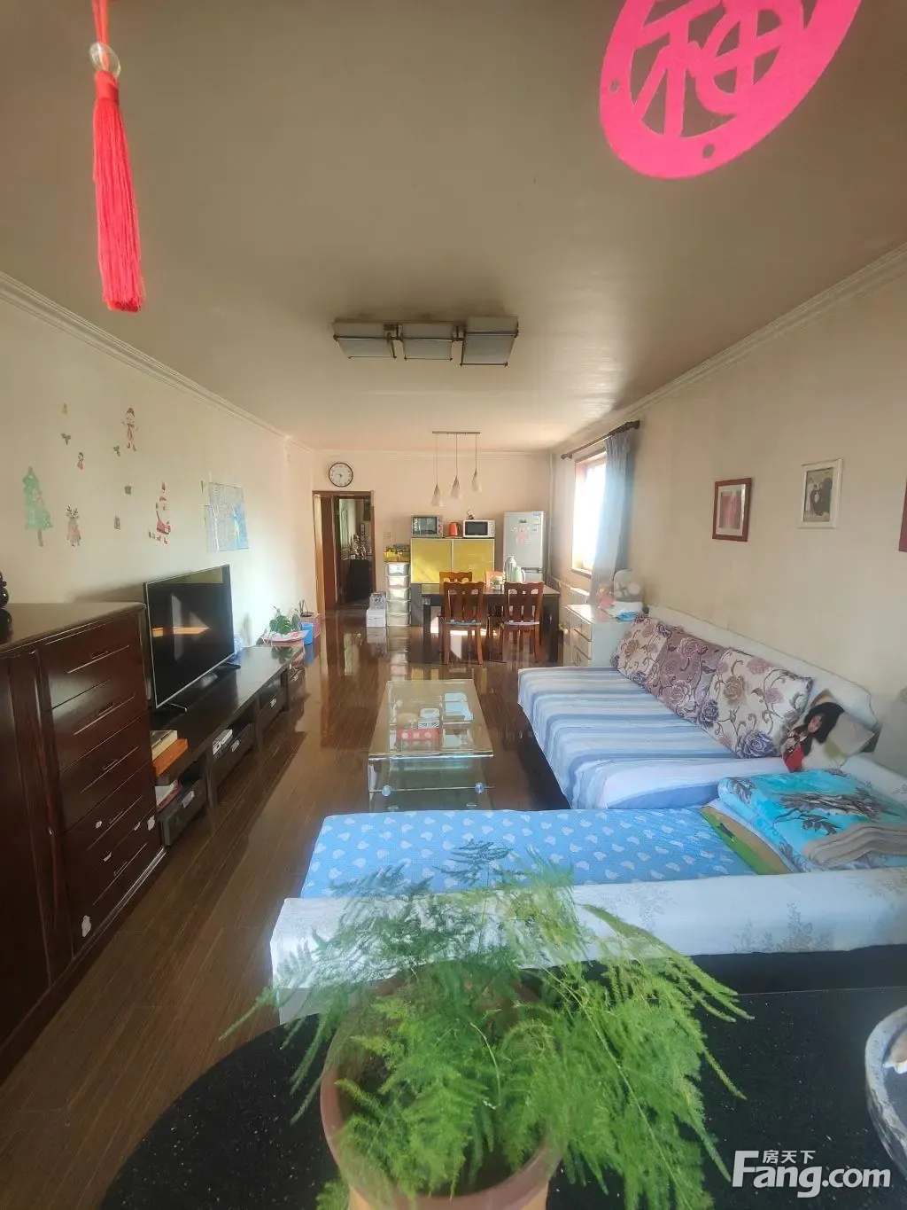 东南北通透格局,客厅和大卧室相连朝东有窗户,客厅有17平米左右,厨房朝东有窗户,两个卧室朝北,主卧南向带一个大阳台,采光比较好,没有遮挡,房子是实木装修,家具家电比较好摆放,符合现代年轻人对住宅的户型理念。