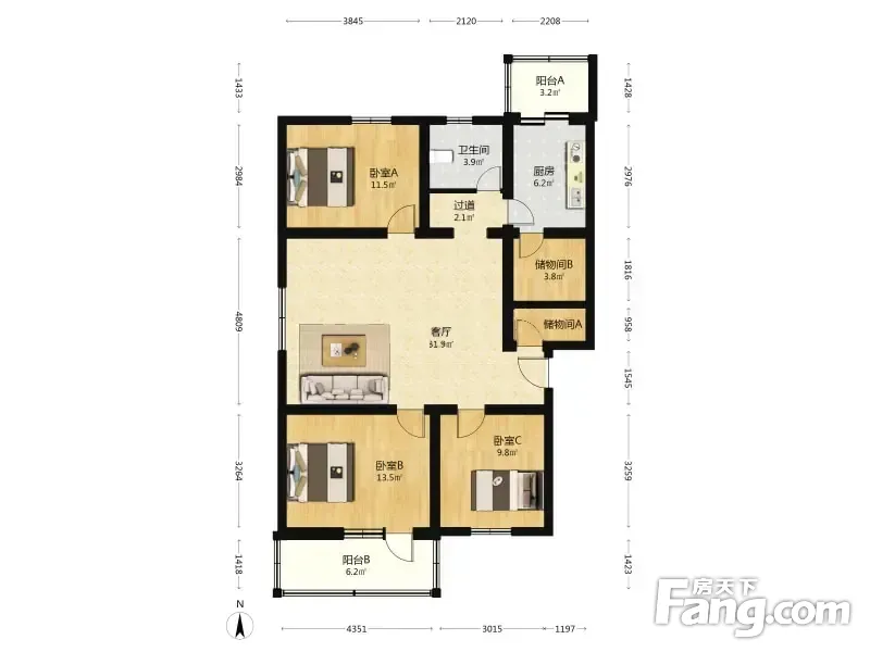 户型齐全,主打户型方正,明厨,主卧朝南二居