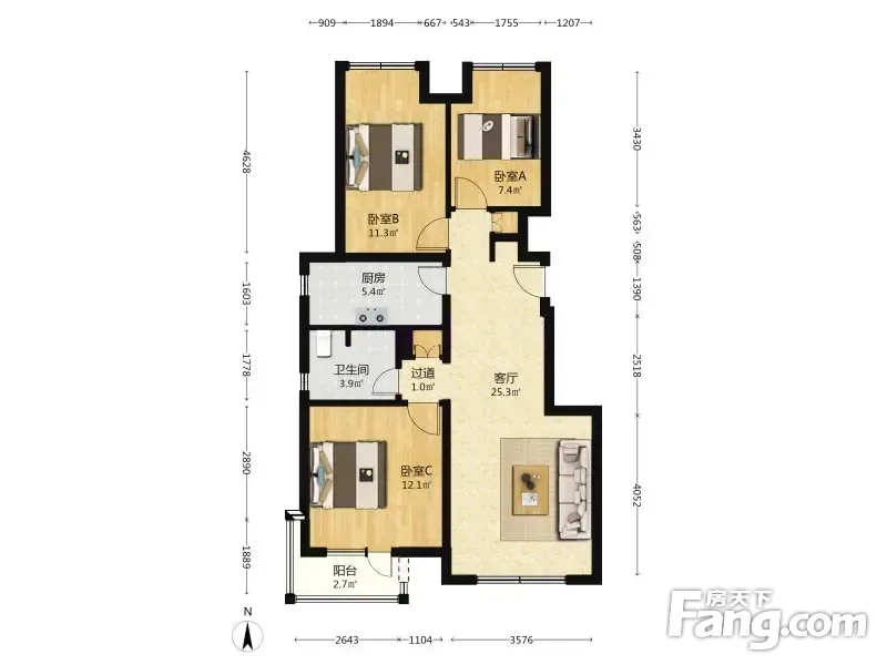 金隅万科城二期 3室1厅 89.96平