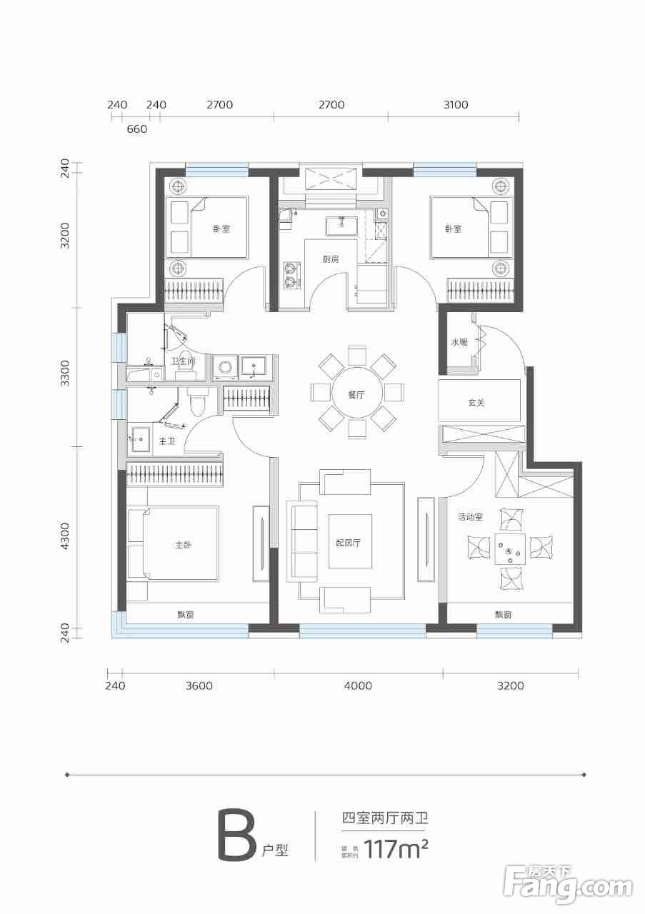 户型|四室两厅两卫 建筑面积约:118㎡ 餐客厨一体+卧室互不干扰+双卫浴配置